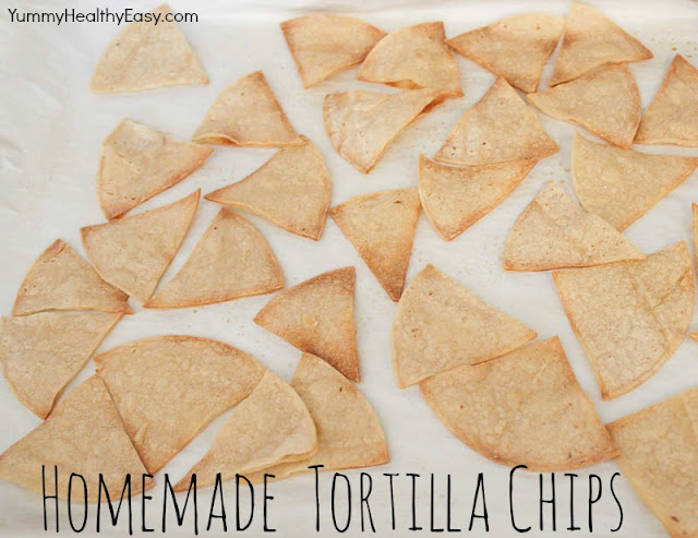 - Chips: Preheat oven to 350 degrees F. Lightly spray both sides of each tortilla with cooking spray (or brush lightly with olive oil). Sprinkle both sides with salt.