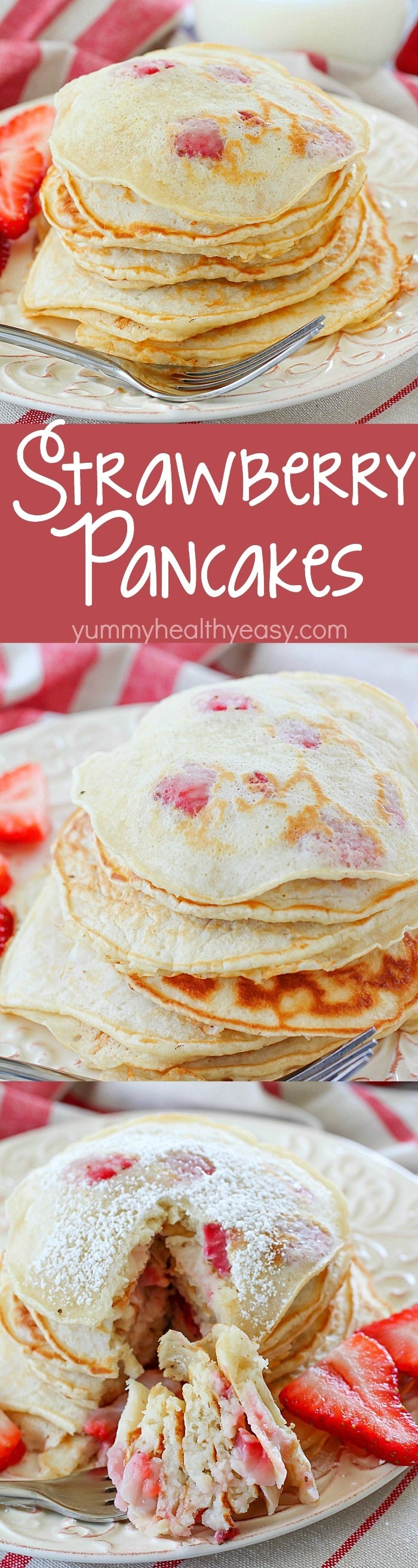 Start your day right with a stack of Strawberry Pancakes! Every bite is filled with strawberries! They’re a quick, easy to make breakfast the whole family will love!
