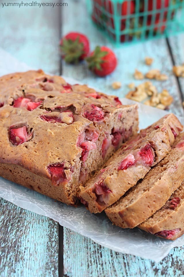 - Lightly stir in the oil and then fold in the chopped strawberries and chopped toasted walnuts. Stir until just combined. Pour into loaf pan and smooth top down evenly. Bake for 40-45 minutes, or until toothpick inserted in the middle comes out clean. Cool in the pan for 15 minutes and then remove loaf and devour. 🙂 Enjoy!