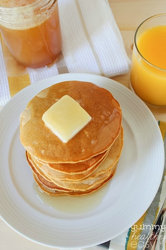 Anyway, enough about my love-hate relationship with Halloween…you have to try these pumpkin pancakes! They’re a family favorite. We make pancakes probably every weekend. I love this recipe because the pancakes come out light and moist and have just the right amount of pumpkin. Plus they’re almost guilt-free! They’re amazing with my homemade buttermilk syrup recipe but healthier if you use a sugar-free maple syrup. Either way, you’re going to love them. Have a safe Halloween!!