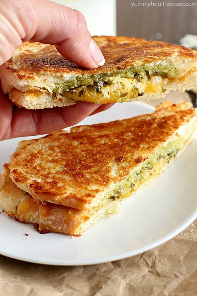 What’s not to love though? Crispy, golden, buttery exterior with ooey, gooey cheese melted inside? YUM. But why don’t we kick it up a notch and add pesto? (My homemade pesto version is the bomb!) I think this makes the classic a little more adult, don’t you think? Also, pesto is green so that means it’s healthy right?? 😉