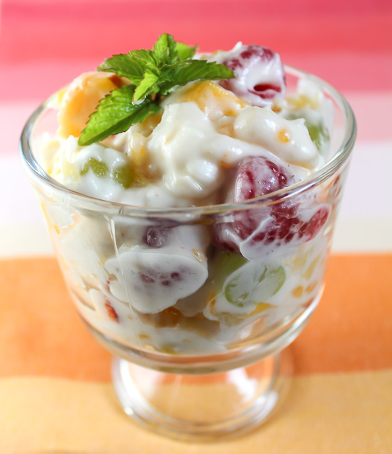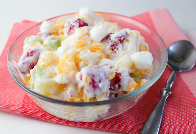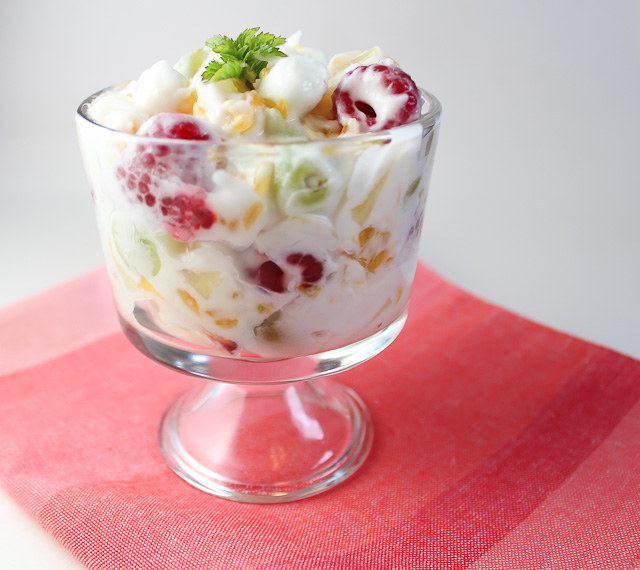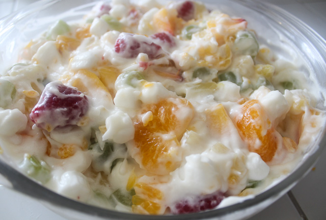 *In the fruit salad photos: There is 1 can drained mandarin oranges, 1 drained can pineapple tidbits, about 1 cup sliced green grapes, 1 sliced peach, 1 carton fresh raspberries, 1 cup mini marshallows and 1/4 cup of shredded coconut.*
