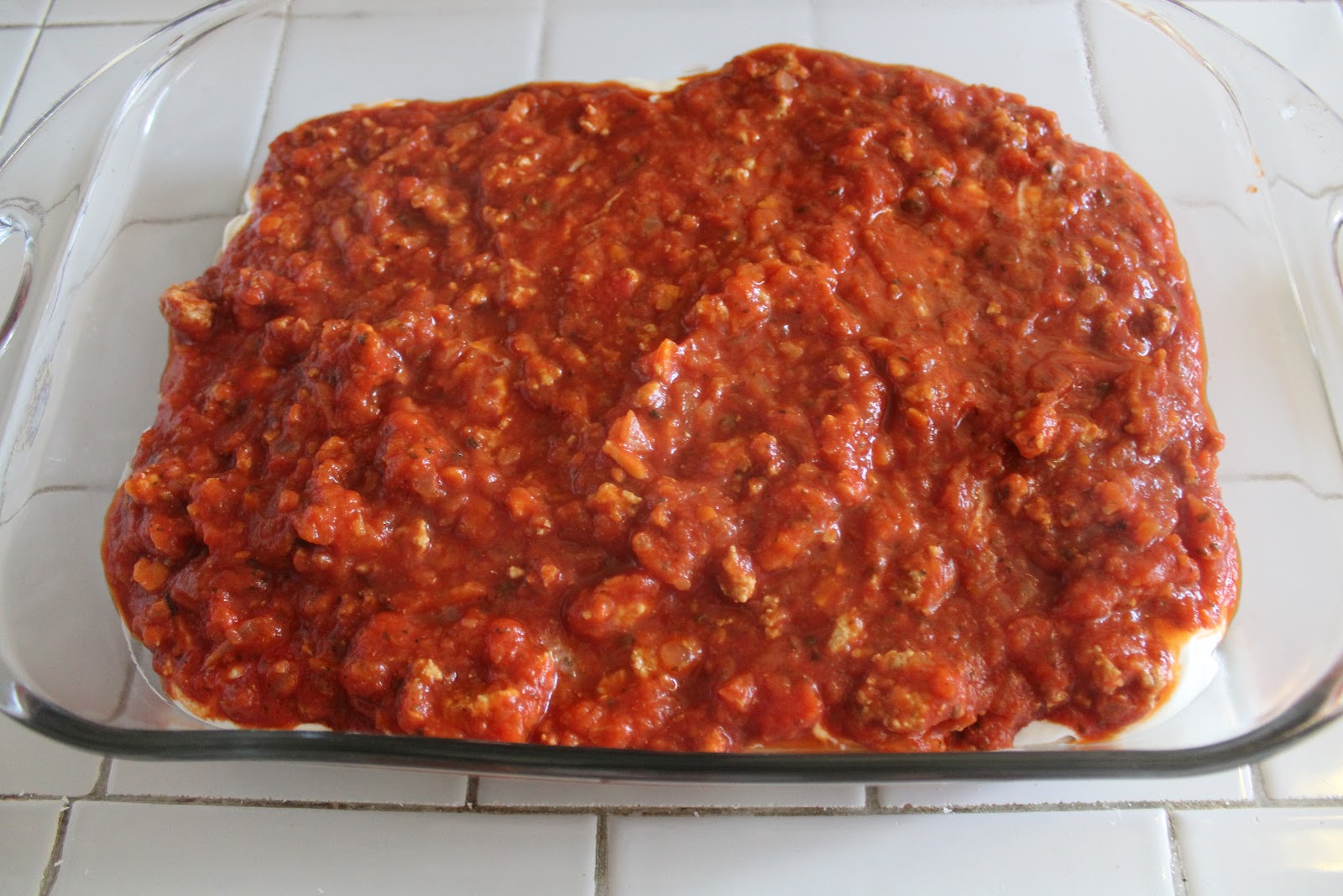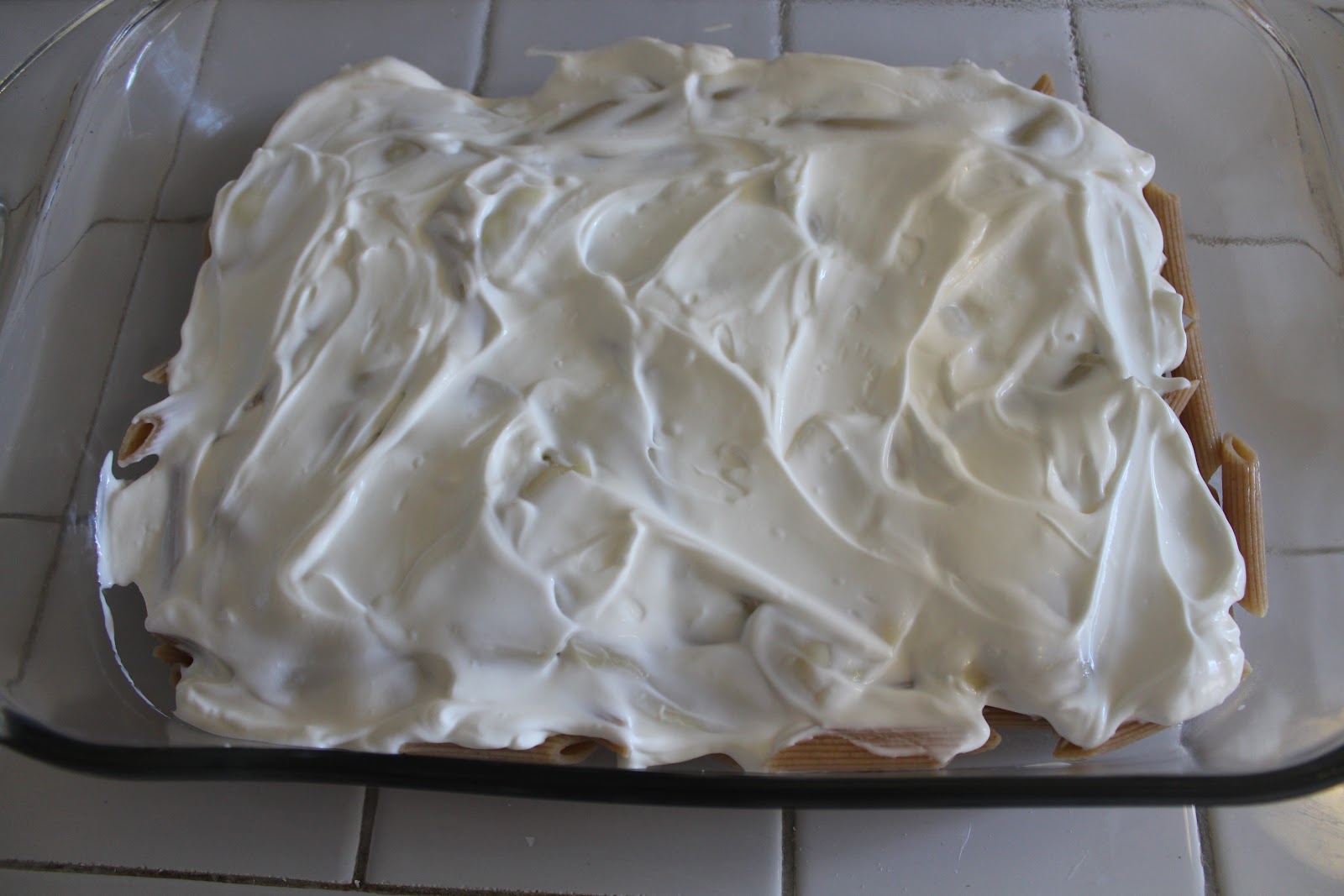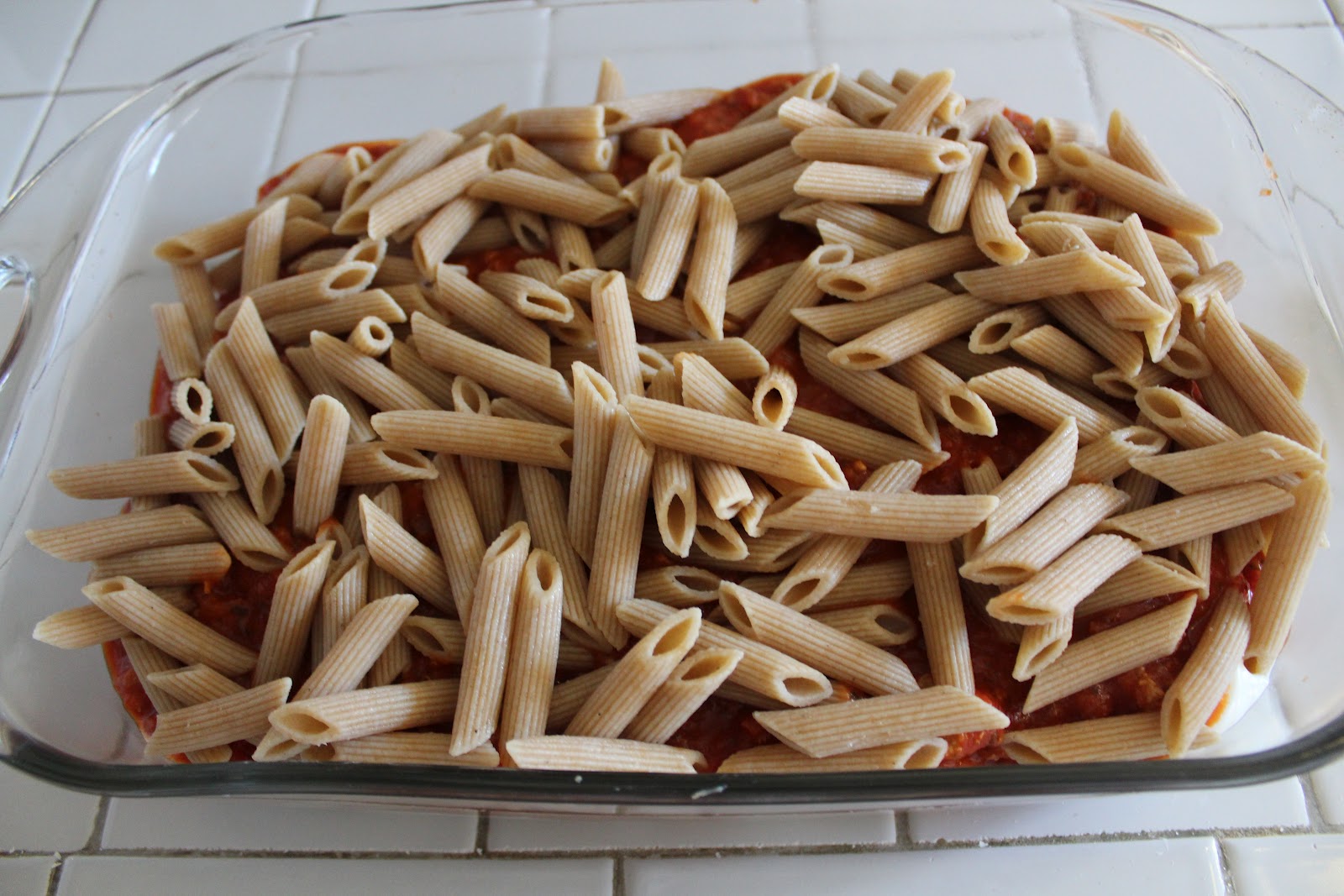 - Layer ingredients into prepared baking dish as follows: half the cooked penne pasta, provolone cheese, sour cream, half the sauce mixture, remaining penne, mozzarella cheese, and remaining sauce mixture. Top with grated Parmesan cheese.