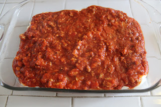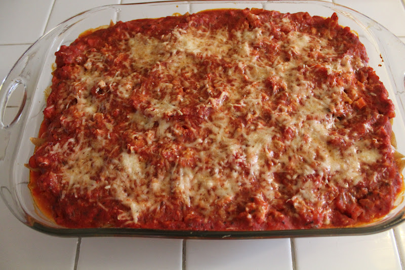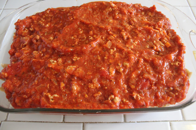 Skinny Cheesy Pasta Bake is a delicious layered casserole made lighter by using ground turkey and whole wheat pasta!