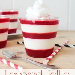 My mom used to make that awesome layered rainbow salad with all the colors of Jell-o and a white layer in between each color. This is similar to that but I used one color instead of multiple. I also added gelatin to each layer so they firm up quickly in the fridge. I love that you can switch up the colors in this to whatever flavor you like. And I love that it’s in a plastic cup! Perfect for little kids. These Layered Jell-o Cups taste great and your family will love them!