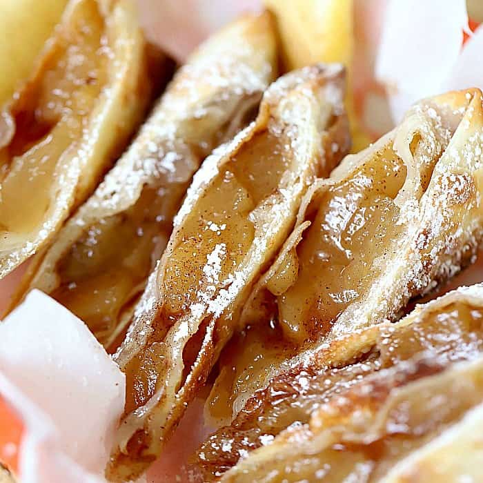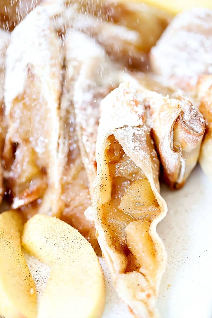 The result creates a light and fluffy crust filled with hot apple pie sweetness! Your typical egg roll wrapper is actually almost as thin as filo (phyllo) dough used for pastries like baklava or other puff pastries.