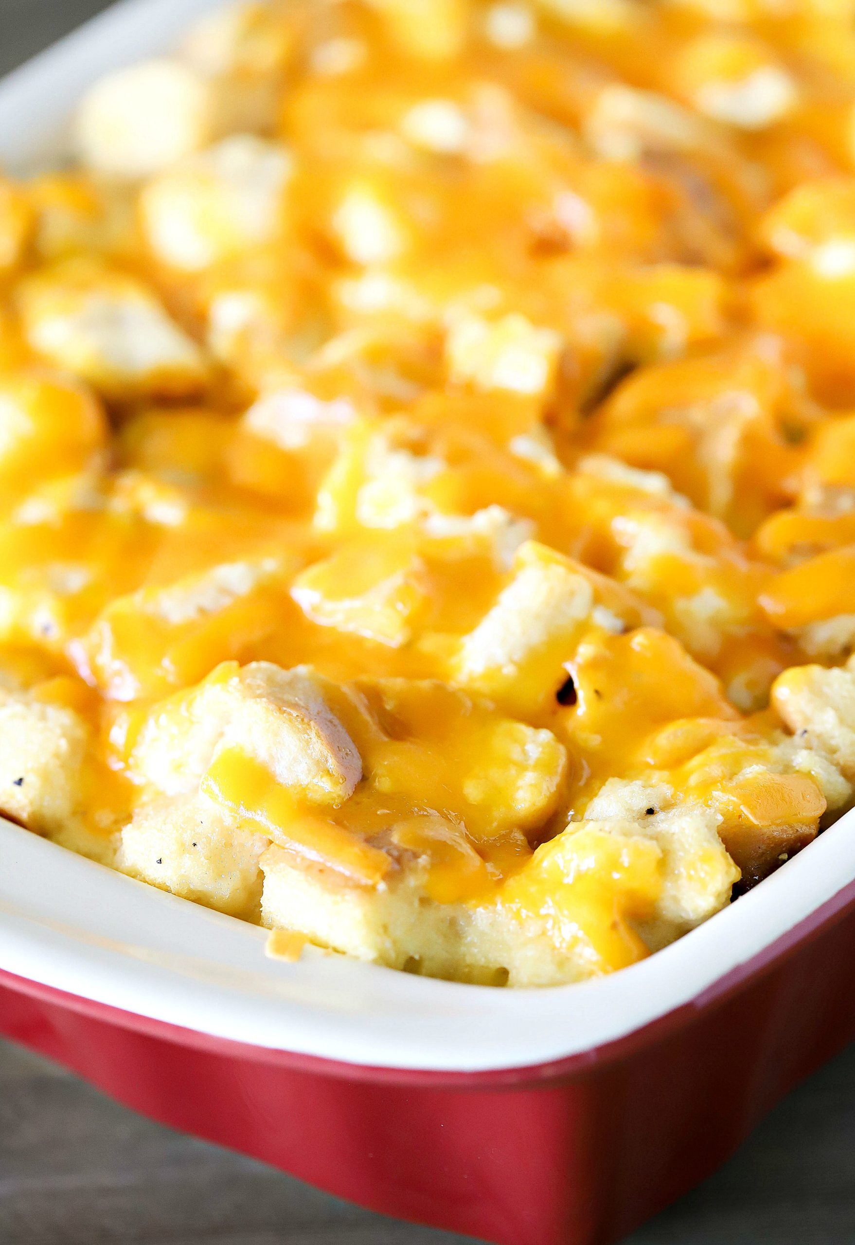 - Top the casserole off with the rest of the soaked bread cubes, spread evenly and pressed down slightly. Sprinkle with the rest of the grated cheese. Cover and let strata sit at room temperature for 1 hour before baking.
