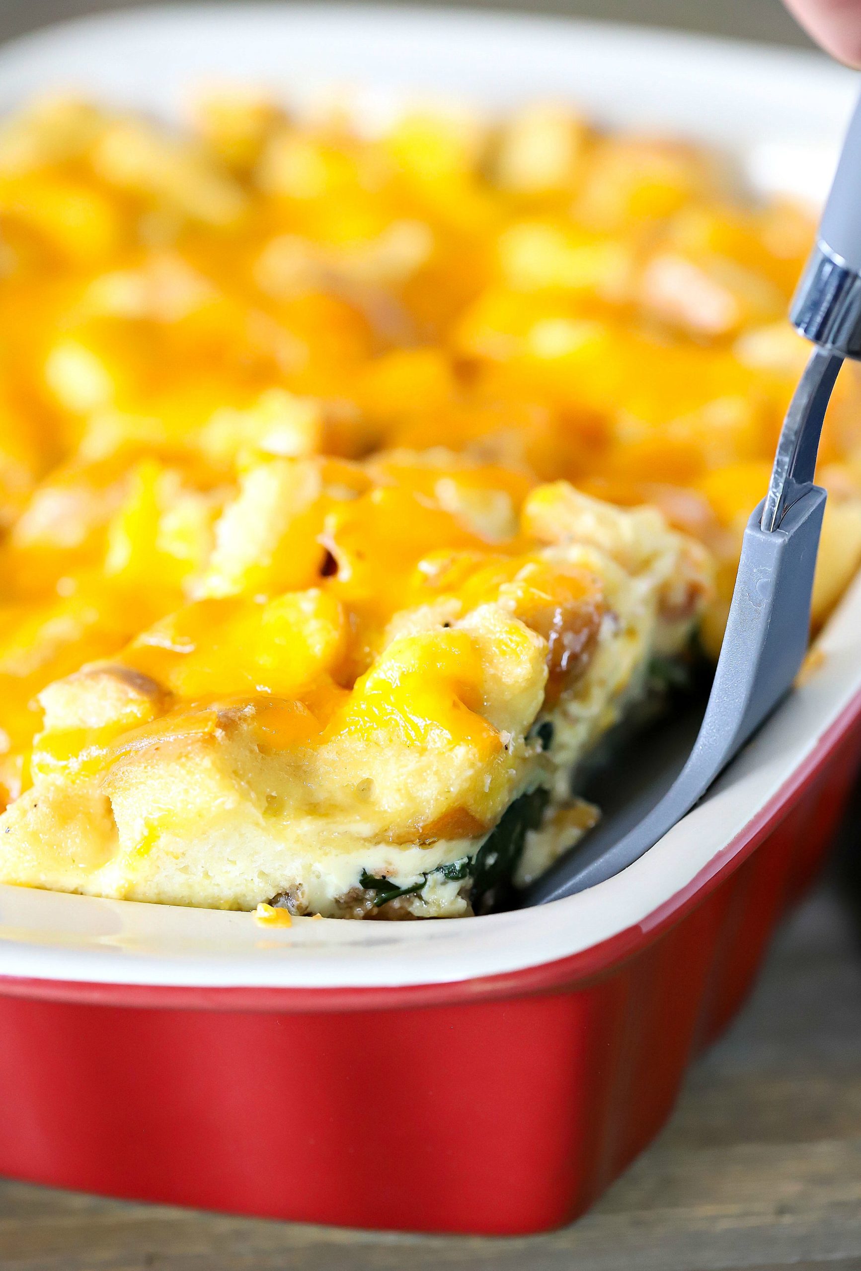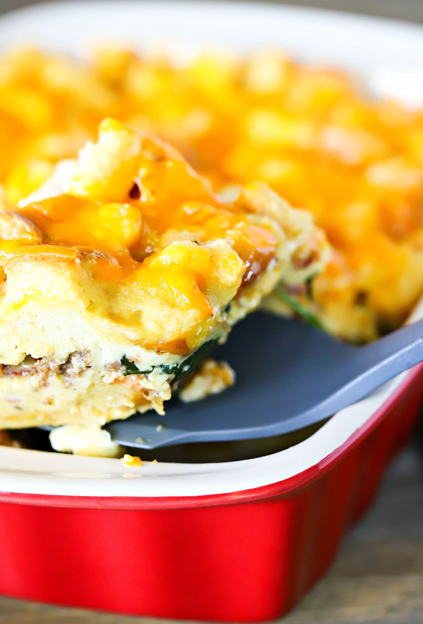 - Transfer half of the bread mixture to the sprayed baking dish. Spread evenly over the bottom and press mixture down a bit. Top with half of the grated Cheddar cheese. Add cooked bacon, sausae, wilted spinach and caramelized onions in an even layer.