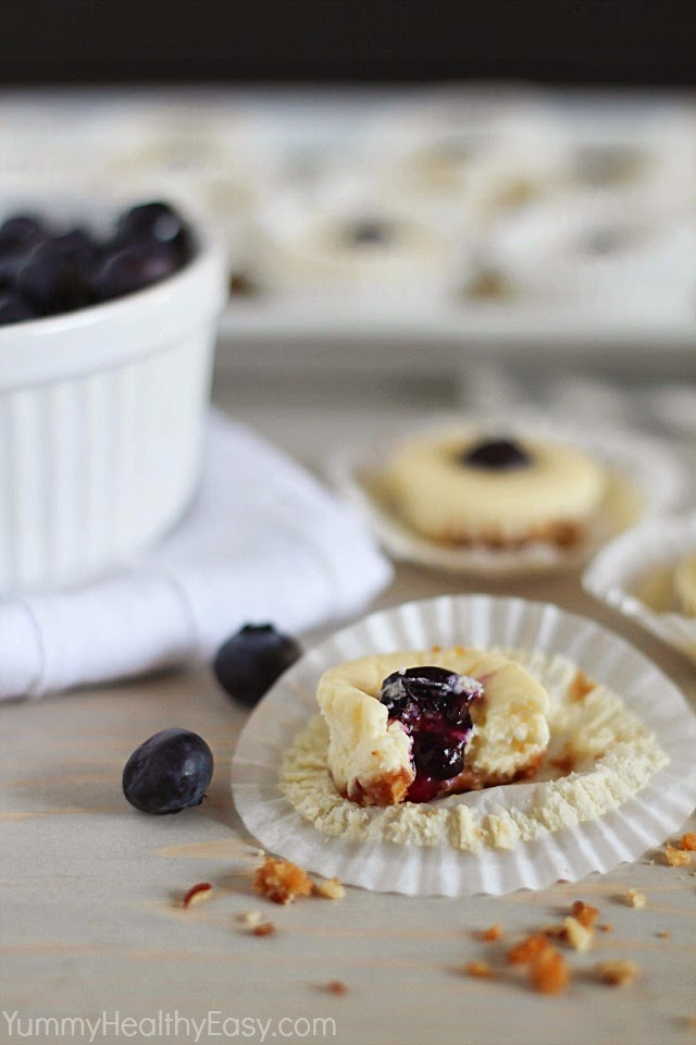 These Skinny Cheesecake Bites have a crunchy crust and smooth cheesecake filling with a blueberry placed right in the center. When you bite into the middle, the blueberry explodes and almost makes a little jam topping. It is SO good!