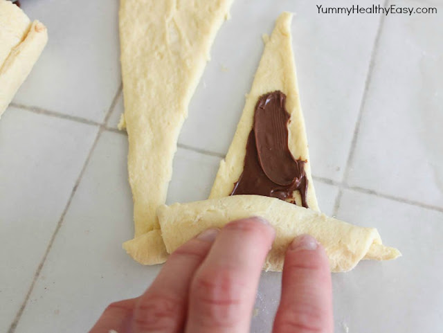 - Spread about a tablespoon of Nutella down center of each crescent roll and roll up. Place on cookie sheet and bake according to crescent roll package directions.
